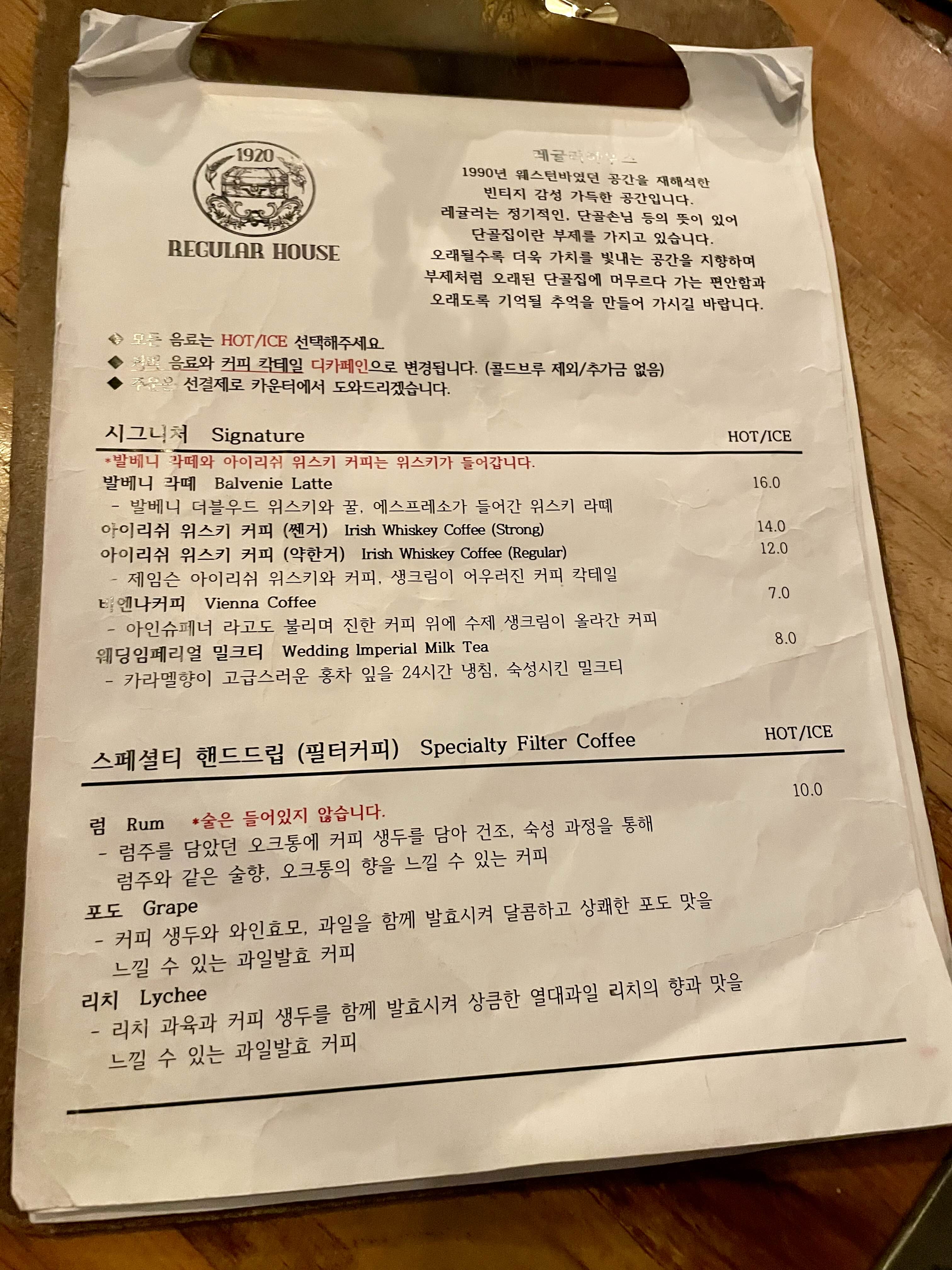 핸드드립, 발베니 라떼, 아이리쉬 커피, 칵테일, 위스키, 하이볼, 디저트