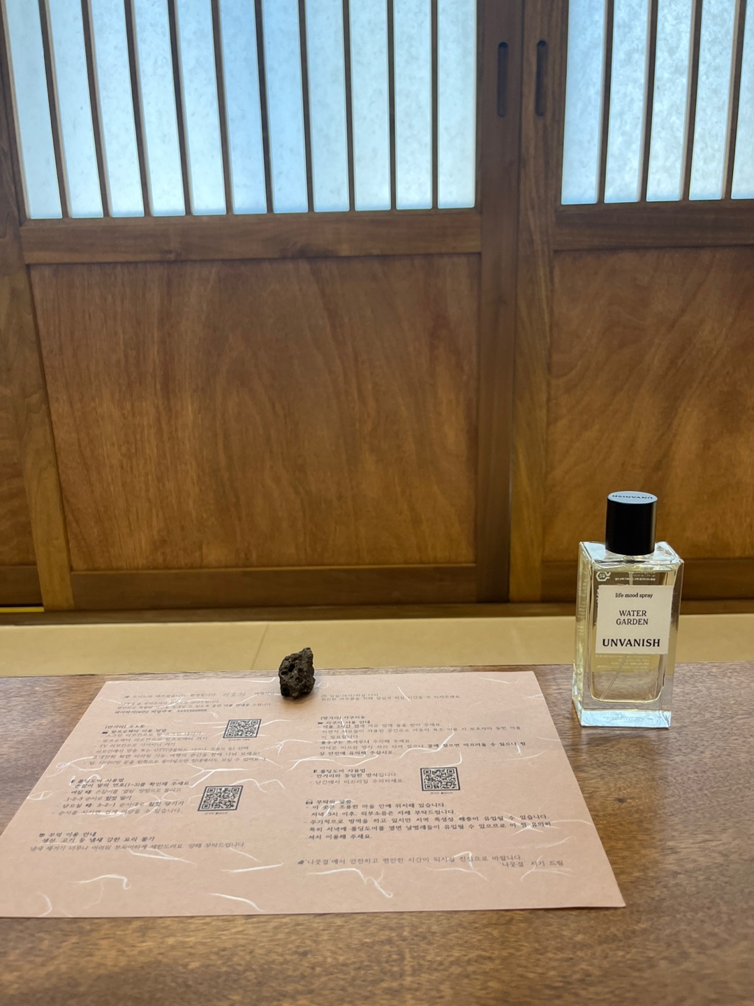 '공간 안내' 와 룸 스프레이가 비치되어 있어요.